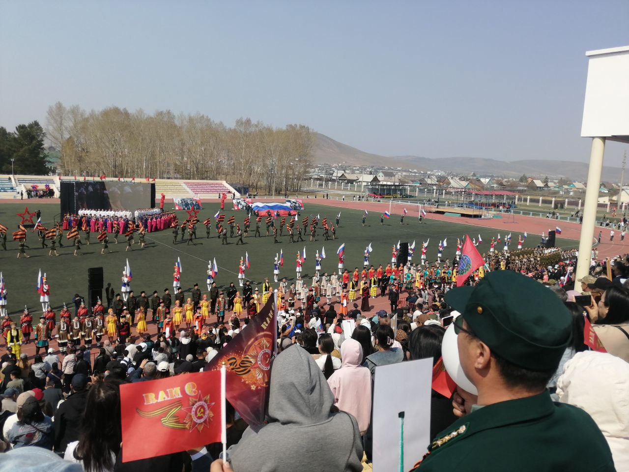 Грандиозное массовое праздничное мероприятие «Помним. Гордимся. Славим!», впечатляющее по своему масштабу, состоялось на центральном стадионе п.Агинское.